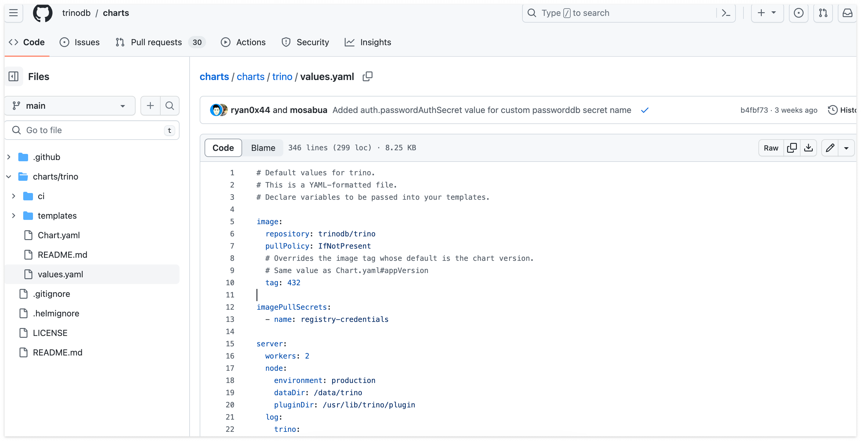 위와 같이 명령어를 입력하면, 구성한 kubernetes 환경에 Trino가 배포됩니다. 하지만 각자의 환경에 맞게 잘 배포됐다고는 장담할 수 없습니다. 앞선 문단에서 소개한 것처럼 차트의 구성엔 크게 values.yaml 파일과 templates 폴더가 있습니다. 여기서 values.yaml 파일은 templates 폴더에 구성된 파일들에 사용될 변수들이 모여있습니다. Trino 차트 리포지토리를 살펴보면 Trino 배포에 사용된 values.yaml 템플릿을 볼 수 있습니다.