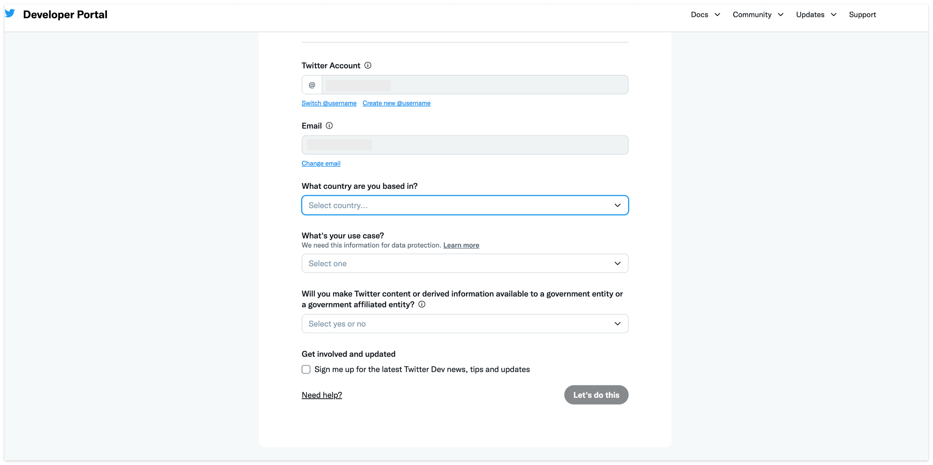 아래 이미지는 개발자 계정 가입 절차입니다. 먼저 국가 선택 및 API를 사용하려는 목적을 선택합니다.
