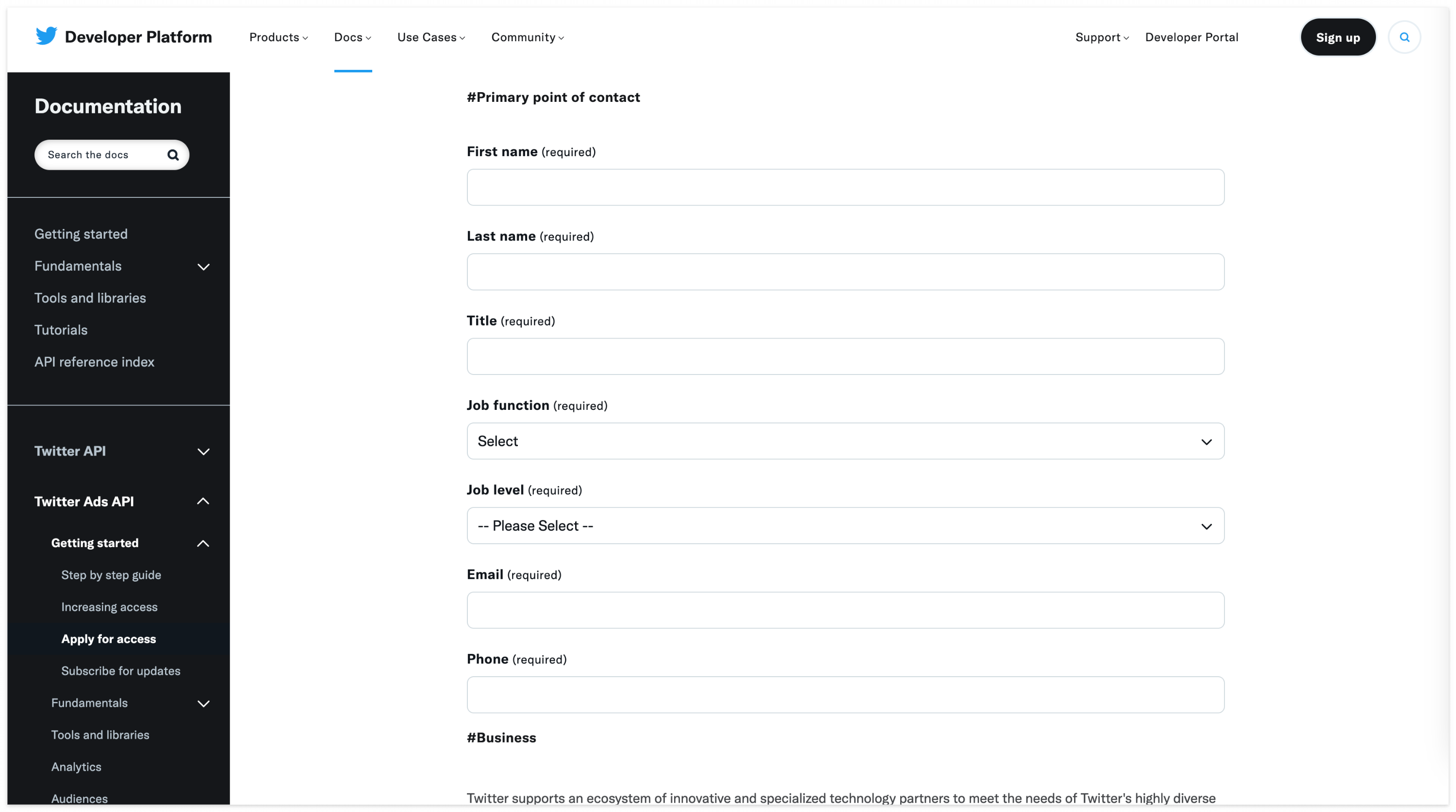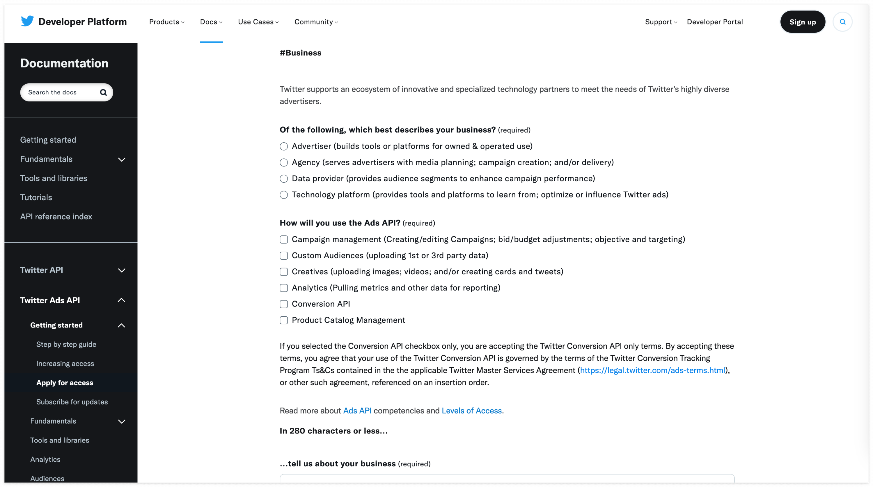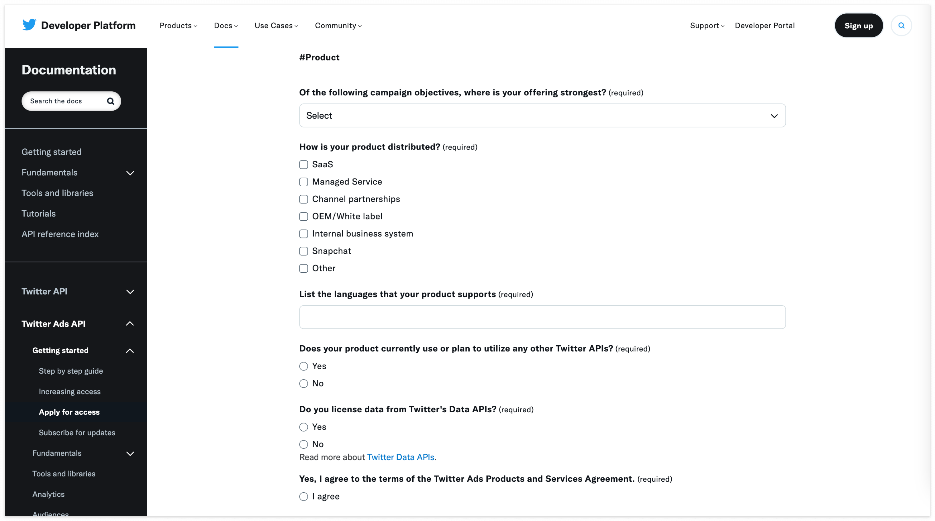 위의 두 단계는 일반적으로 Twitter API를 사용하기 위한 절차와 동일합니다. Ads API를 사용하기 위해선 추가로 액세스 요청을 진행해야 합니다. 공식문서에 나와있는 액세스 신청 페이지로 넘어가면 아래와 같은 페이지가 나옵니다.