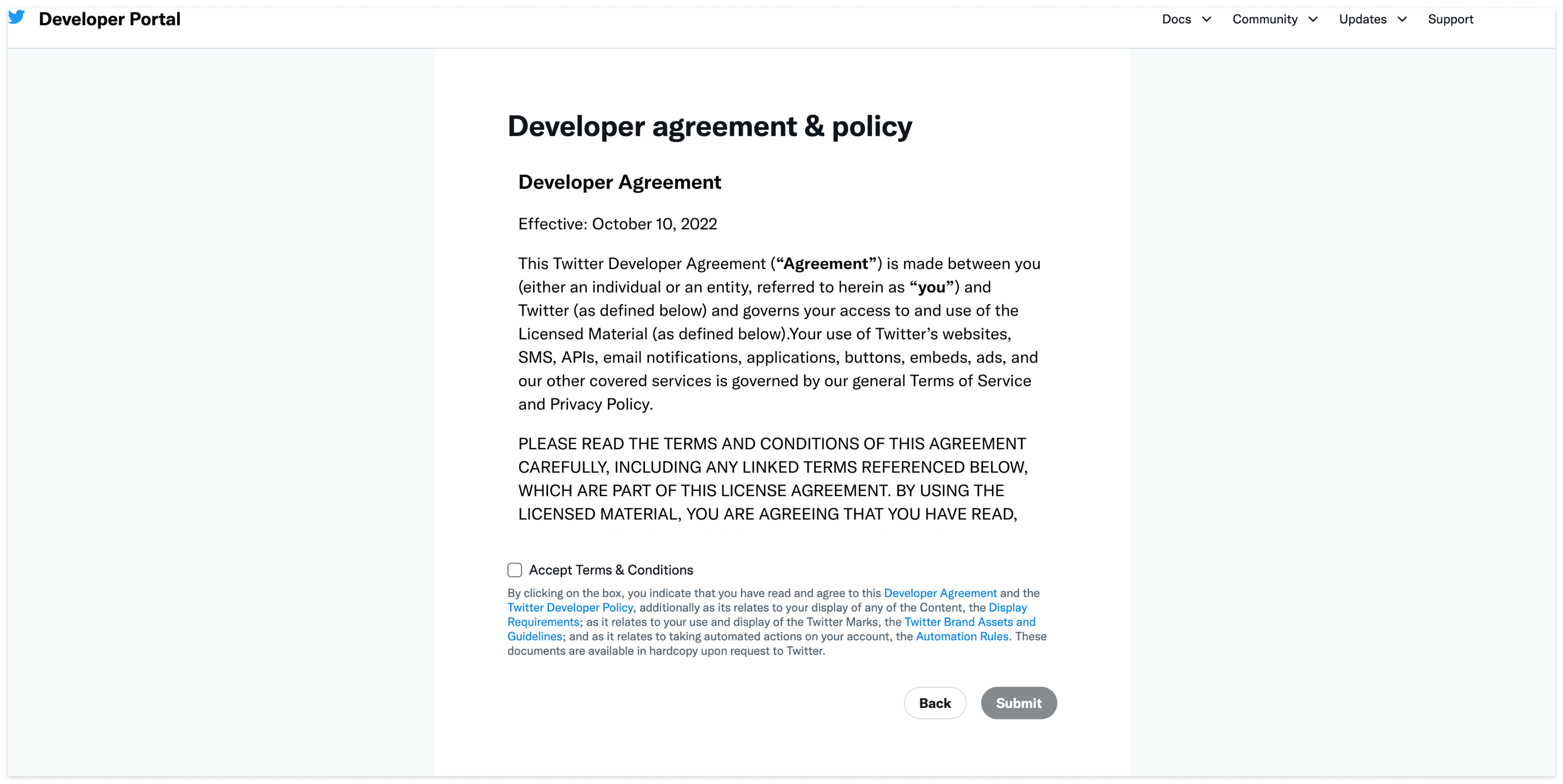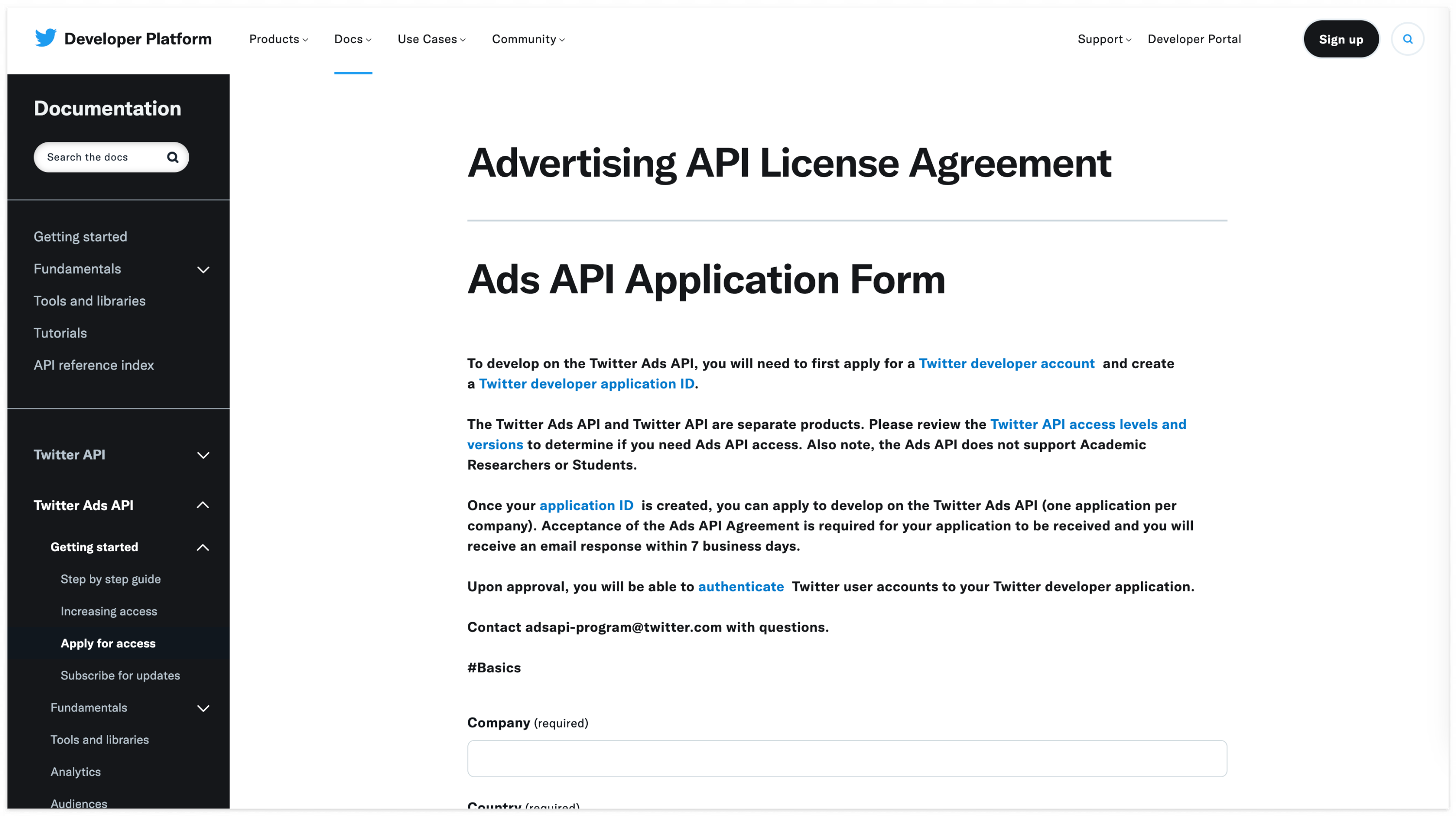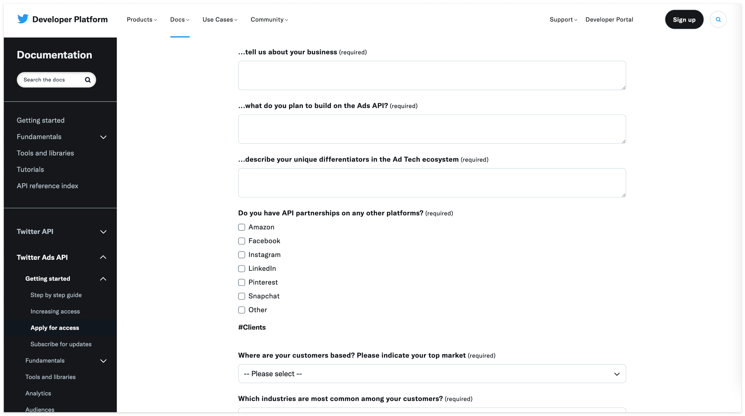 위의 두 단계는 일반적으로 Twitter API를 사용하기 위한 절차와 동일합니다. Ads API를 사용하기 위해선 추가로 액세스 요청을 진행해야 합니다. 공식문서에 나와있는 액세스 신청 페이지로 넘어가면 아래와 같은 페이지가 나옵니다.