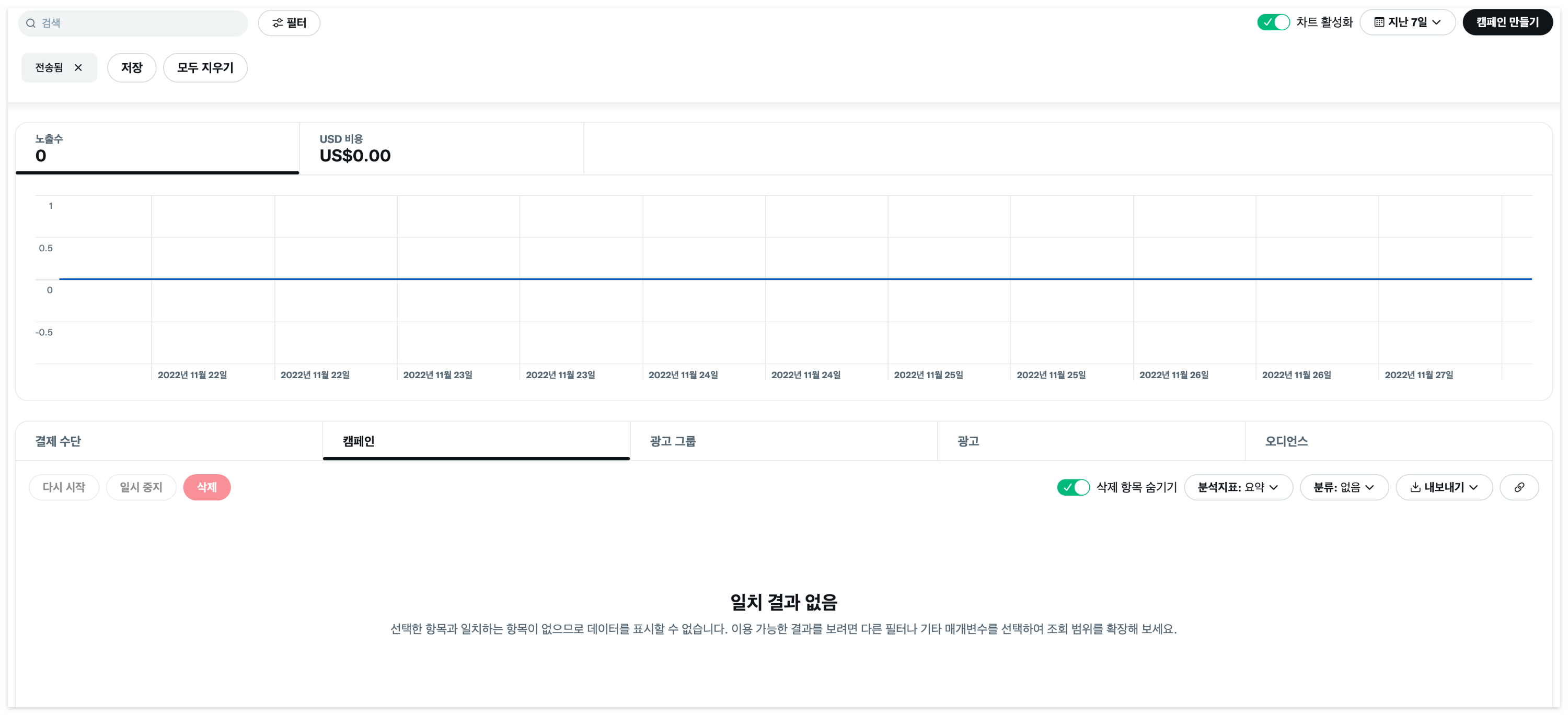트위터 API 개발 문서를 살펴보기에 앞서 트위터 광고가 어떻게 운영되고 있고, 어떤 기준으로 데이터를 제공하고 있는지 살펴볼 필요가 있습니다. 광고 매니저로 들어가면 아래 이미지와 같은 페이지를 볼 수 있습니다. 광고를 운영 중이라면, 매니저 페이지에 필터 조건에 따른 비용에 관한 차트를 보여주고 광고 단위별로 비용, 노출, 클릭 등을 집계하여 표로 제공합니다.