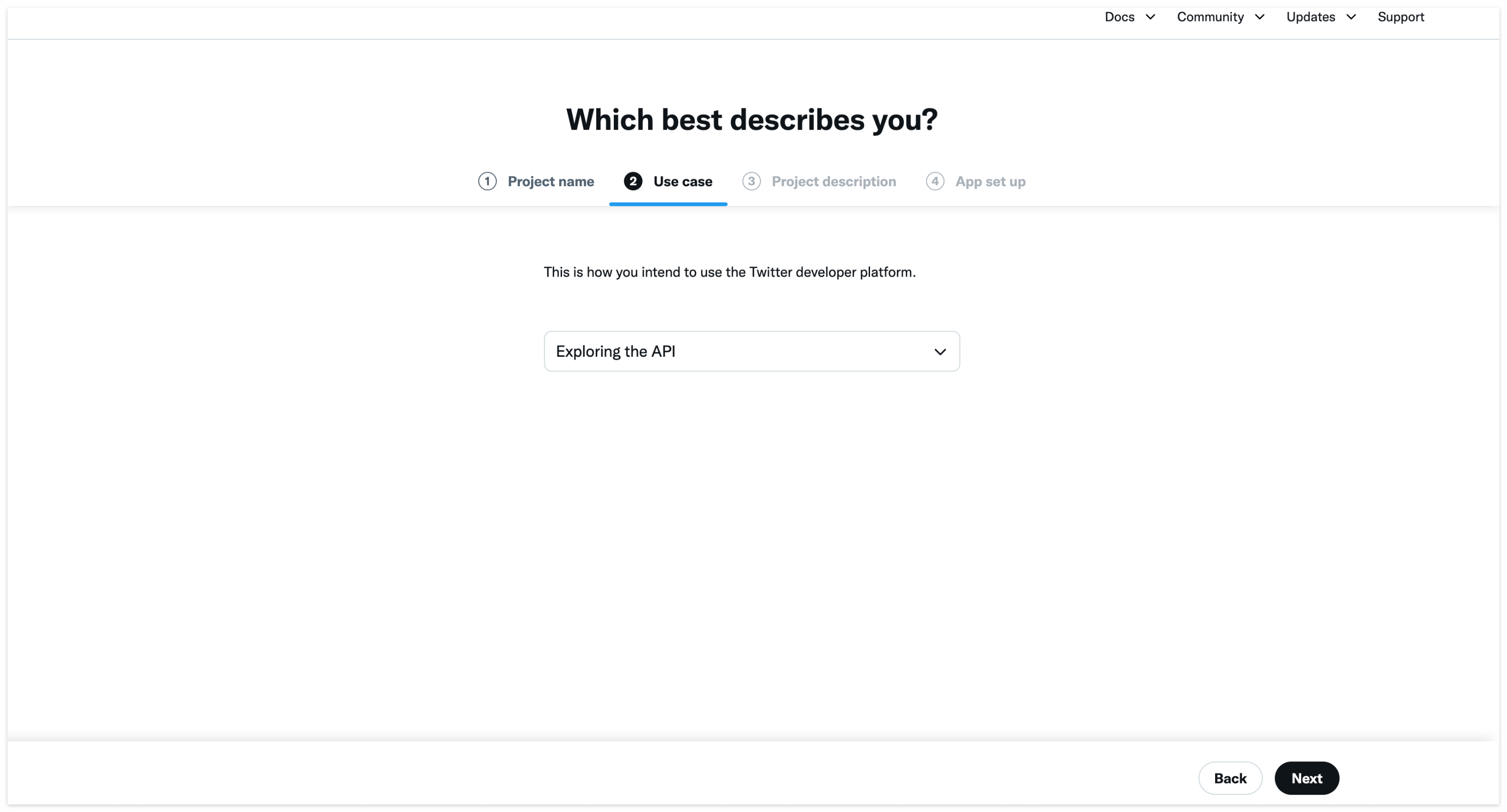 트위터 광고 API를 통해 만들 제품에 대한 설명을 기재합니다. 저의 경우 데이터를 제공할 목적으로 사용하기 때문에 Internal business system을 선택했습니다.