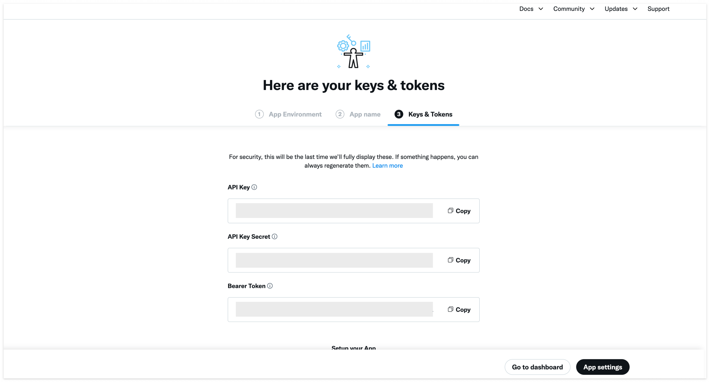 다음으로 넘어가면 앱 생성이 완료됩니다. 앱 생성이 완료되면서, API Key, API Key Secret, Token이 생성되며 노출됩니다.